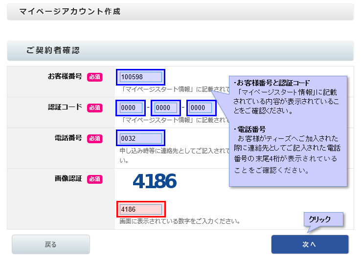 必須項目の内容がマイページスタート情報に記載の内容と一致していることをご確認後、次へボタンを押してください。