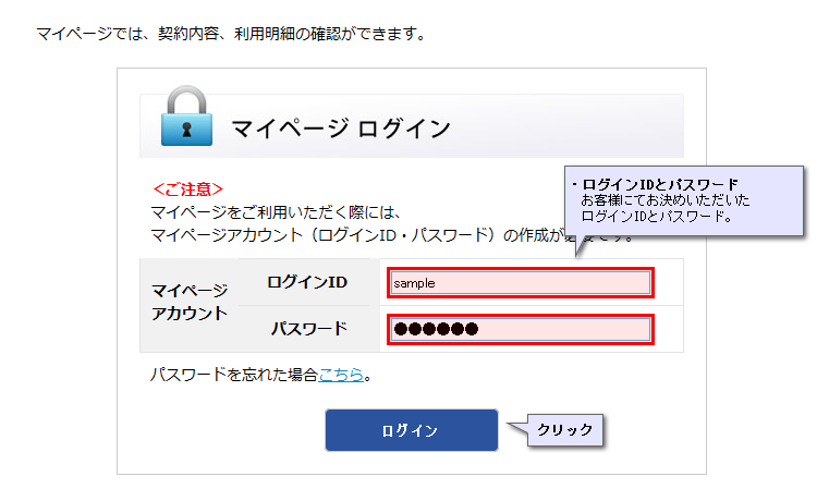 マイページアカウント(ログインID・パスワード)を入力してログイン後、マイページをご利用いただけます。